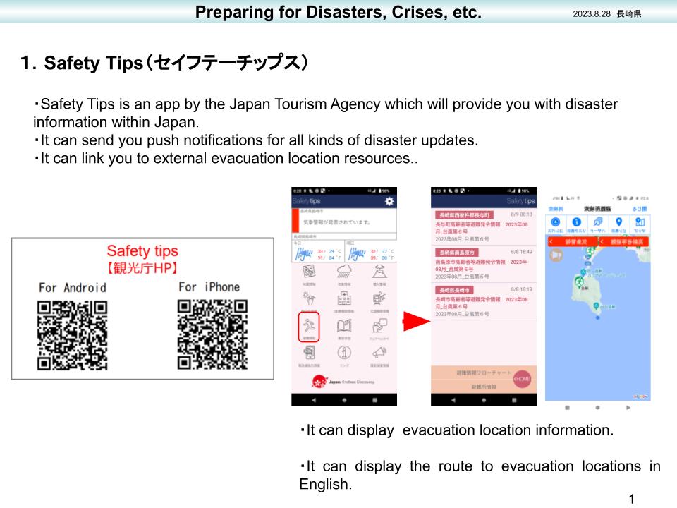 - Safety Tips is the official app created by the Japan National Tourism Agency for foreign tourists and residents in Japan. It provides warnings about natural disasters, as well as evacuation information and communication cards meant to help you gather the information you need from other people. It works in several languages, including English.