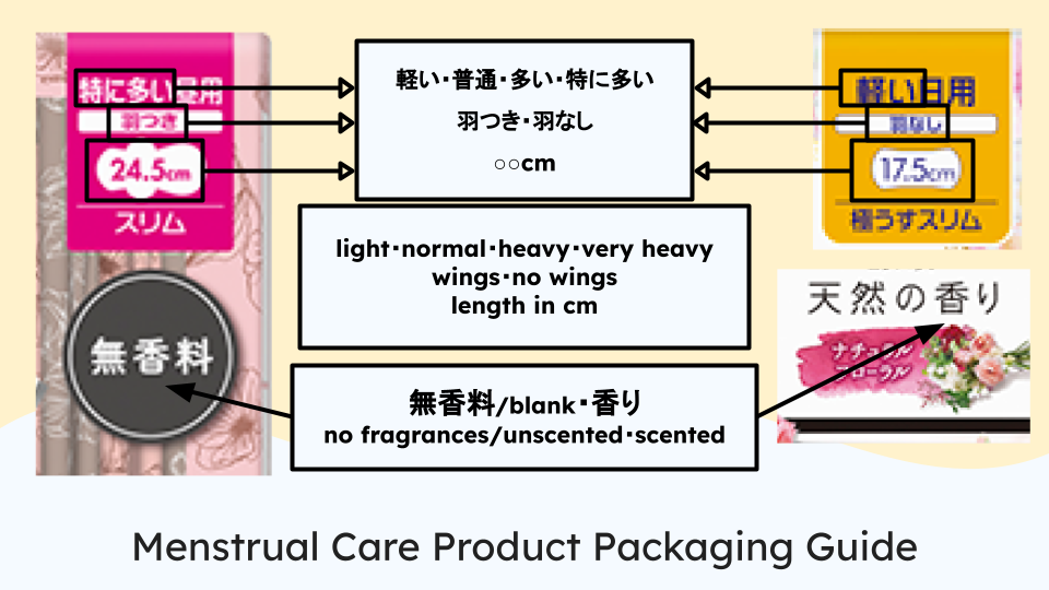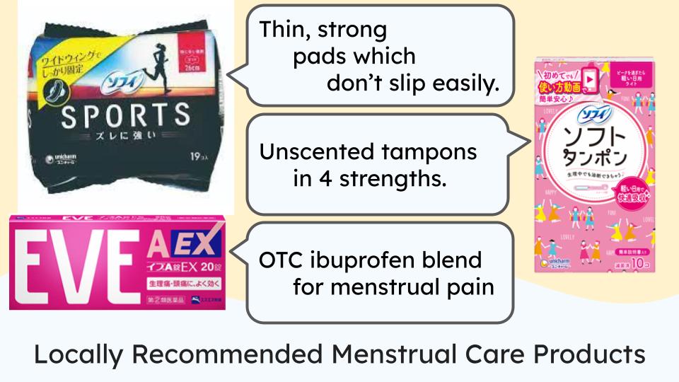 Pads are the most common menstrual product in Japan. Pads come in a large variety of sizes and thicknesses (which don’t always correlate with capacity) so it is important to check packing. Beware of scented pads which may cause irritation. Tampons are also common, but there are fewer varieties. Tampons come in varying sizes based on absorption capacity, and can come with or without plastic applicators. Both pads and tampons can be found in convenience stores, drug stores, general stores and supermarkets.